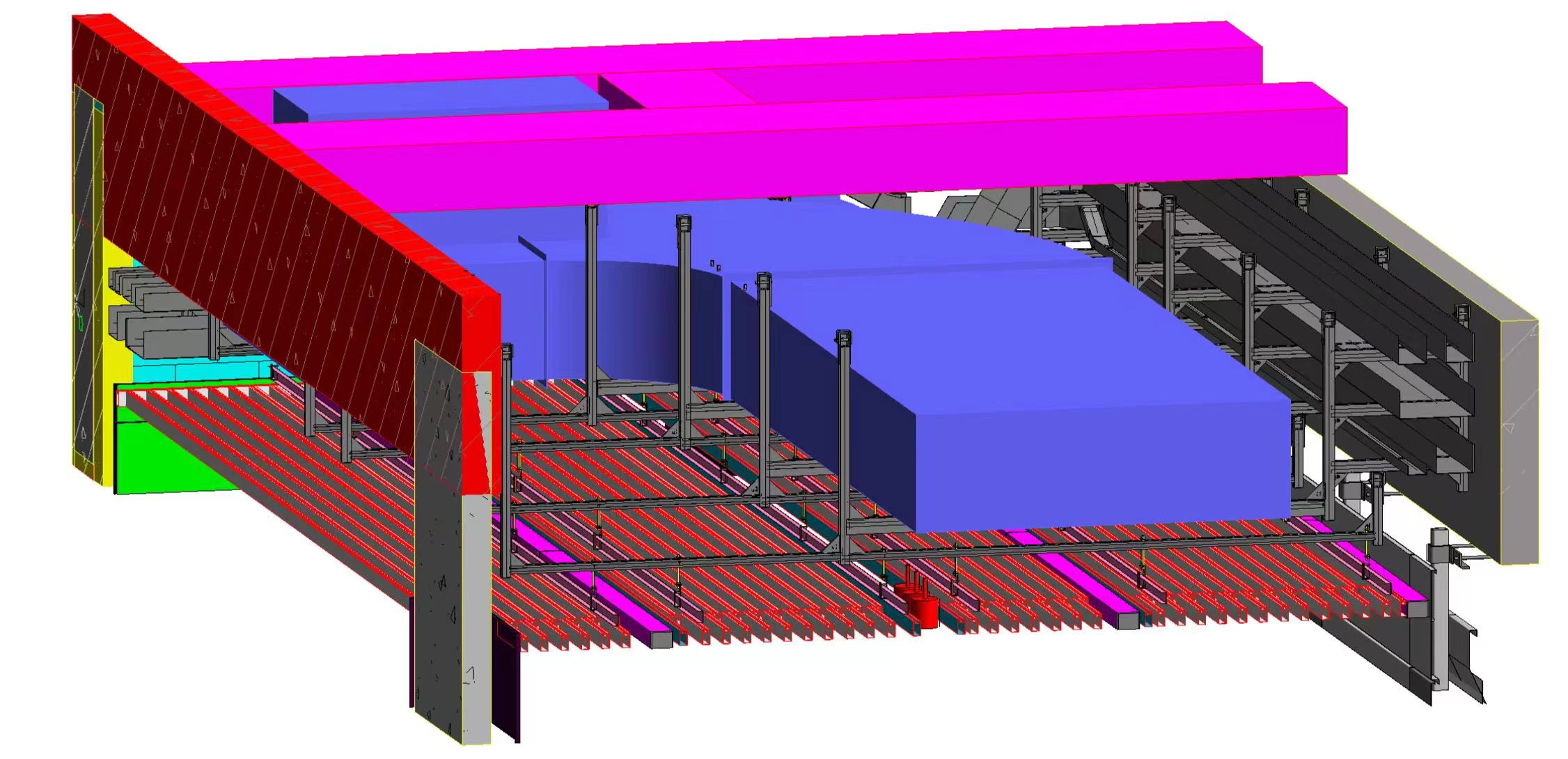 本工程分三個標段,合計總建筑面積為56.1萬㎡,建筑最高高度34.8m,其中一、三標段為多層大跨度鋼結(jié)構(gòu)廠房。眾所周知,對于鋼結(jié)構(gòu)廠房支架設計一直是行業(yè)內(nèi)的難題。華固充分利用BIM技術(shù),自主研發(fā)的成品